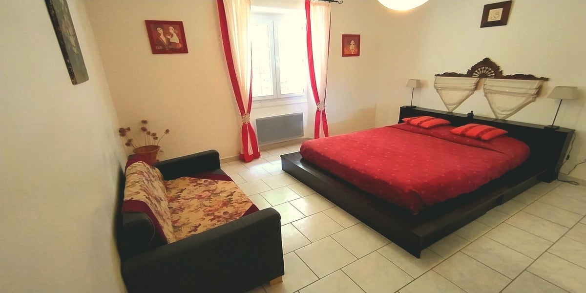 The apartment is very spacious, direct access to the patio from the living room, equipped with a convertible sofa bed for 2 persons, a TV and Hi-fi system.