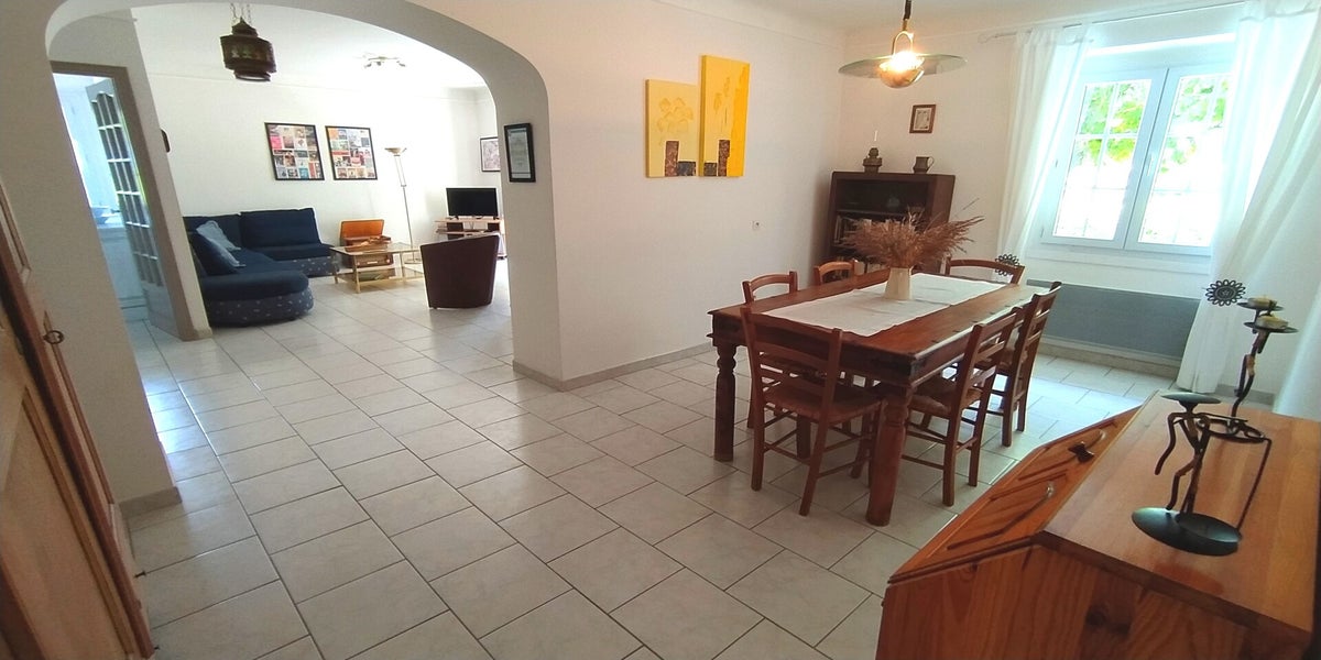 Une grande salle à manger lumineuse complète ce lieu de vie et vous permettra de prendre vos repas en famille.